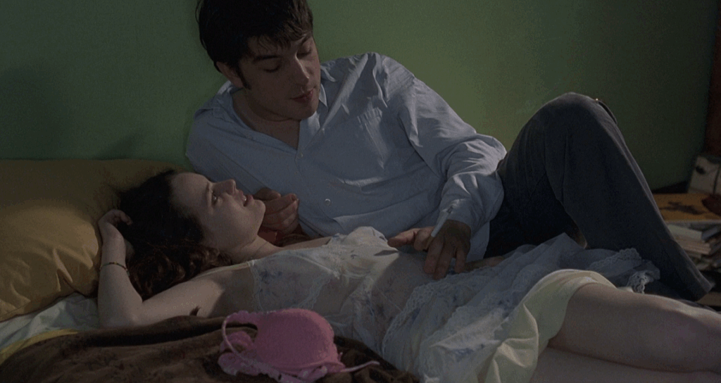 Celui-ci est interprété par l’italien Libero De Rienzo (disparu en 2021 d’une crise cardiaque, des suites d’une overdose, à l’âge de 44 ans), revu par la suite dans Fortapàsc (2011) de Marco Risi, L’Affaire Pasolini (2016) de David Grieco et Miele (2013) de Valeria Golino. Un solide acteur, charismatique, qui marque le cinéma de Catherine Breillat par sa présence presque spectrale, dont le personnage disparaîtra après avoir eu ce qu’il désirait, autrement dit déflorer Elena, afin de laisser à jamais son empreinte sur elle. Tout cela devant les yeux d’Anaïs, qui écoute aussi leurs longs échanges durant l’acte.