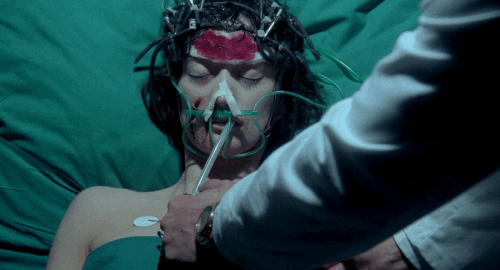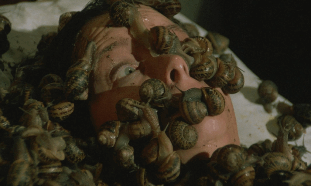 Du point de vue passage de vie à trépas, Lucio Fulci et son équipe de maquilleurs/effets spéciaux redoublent d’imagination, à l’instar de cette scène qui préfigure La Nuit au musée, où une adolescente se retrouve la gorge prise entre les mains en pierre d’une statue, ou comme le prof de gym imbu de sa personne, qui voit son reflet sortir du miroir dans lequel il a l’habitude de s’admirer, pour aller l’étrangler. La séquence qui reste en mémoire demeure celle où une autre victime est allongée sur son lit, recouverte de gastéropodes à coquille, qui se multiplient et finissent par l’étouffer.