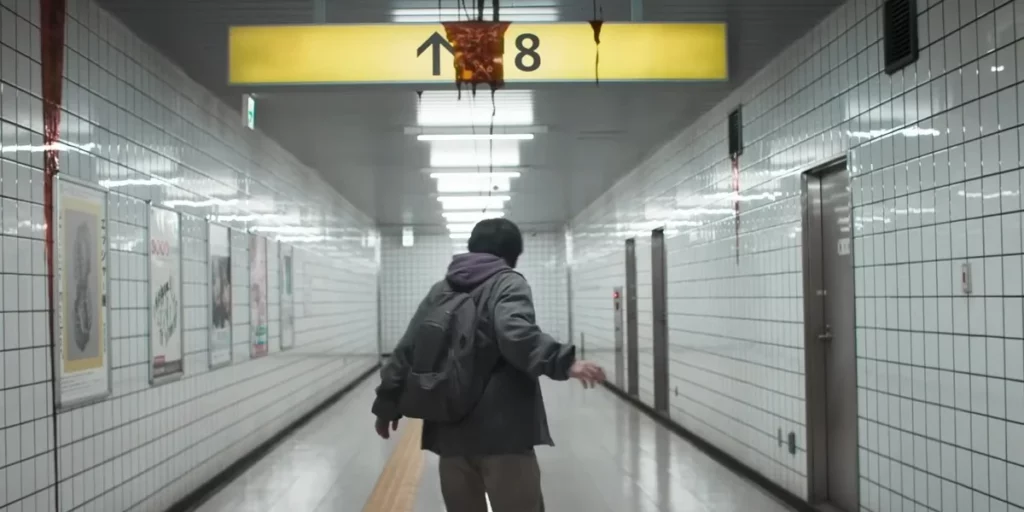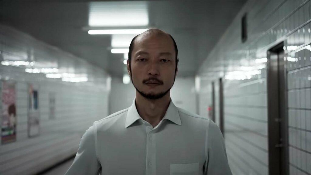 Tous ces questionnements, intériorisés, sont magistralement rendus par Kazunari Ninomiya, acteur déjà croisé il y a vingt ans au cinéma dans Lettres d’Iwo Jima de Clint Eastwood. Le cheminement mental de son personnage s’éclaire à mesure de son épreuve inattendue et de ses diverses rencontres, celles avec un homme qui marche (et dont le sourire restera gravé dans les mémoires) qui illustre d’ailleurs l’affiche d’exploitation internationale, un enfant, une fille détraquée, tandis que plane l’ombre de l’ex-petite amie incarnée par Nana Komatsu, vue dans Silence de Martin Scorsese. Exit 8 reconstitue le décor vu dans le jeu vidéo et s’avère glaçant, comme si le metteur en scène et son chef opérateur Keisuke Imamura parvenaient à faire ressortir le surnaturel dans ce qu’il y a de plus commun, du quotidien, du banal.