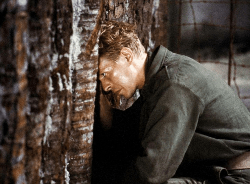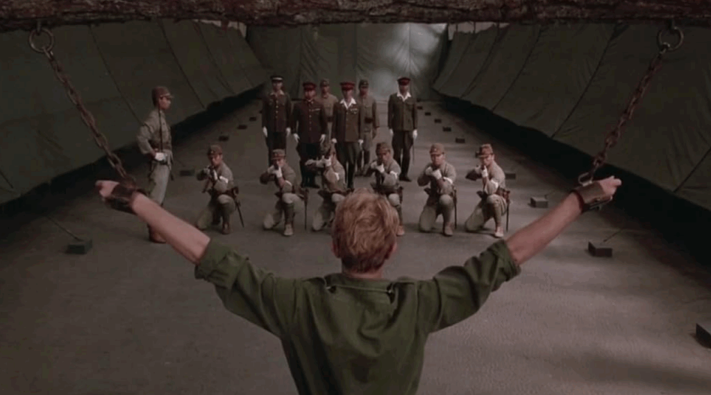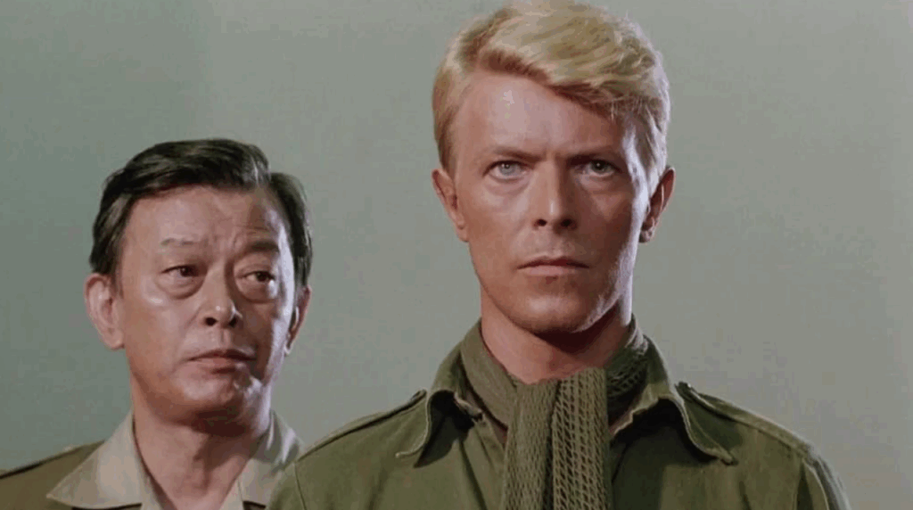 C’est l’histoire d’une passion qui ne se dit pas. Ou quand le comportement rebelle de Celliers entraîne un sentiment d’admiration de la part de Yonoi. Comme Celliers, Yonoi est aussi tourmenté par un sentiment de culpabilité. Yonoi sent en Celliers un alter-ego et veut remplacer le commandant du camp de prisonniers des Britanniques, le group captain Hicksley, par Celliers comme porte-parole des prisonniers. Furyo joue sur l’attente, le non-dit, le regard, l’observation. Un mutisme qui peut entraîner d’être isolé, maltraité. Mais cela ne suffit pas pour certains à l’instar de l’ordonnance de Yonoi, réalisant l’emprise de Celliers sur son supérieur, qui tente de tuer Celliers dans son sommeil une nuit. Il faut un peu de temps pour que Celliers s’ouvre à John Lawrence, se confesse à lui. Nagisa Ōshima réalise alors une des séquences les plus mémorables de toute son illustre carrière, celle du bizutage du jeune frère de Celliers, bossu de son état, qu’il n’a pas défendu comme il le faisait quand ils étaient enfants. Une humiliation qui le traumatisera toute sa vie, qui l’accompagnera – ou qui le conduira – sur le front. Une scène qui démontre à quel point David Bowie en avait aussi sérieusement sous le capot comme comédien.