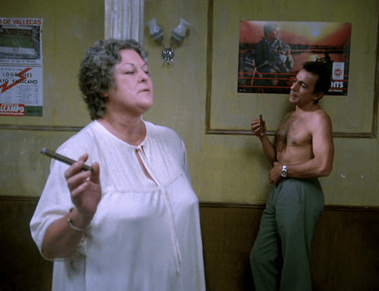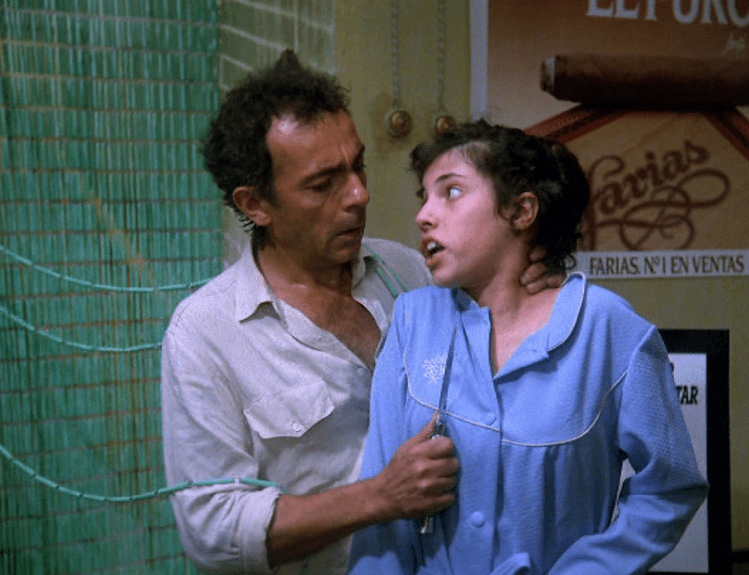 Tous les deux décident de prendre la pétoire, mais c’était sans compter le répondant et la main lourde de la propriétaire des lieux. Celle-ci est interprétée par la géniale Emma Penella, grande dame en son pays, vue entre autres dans L’Emprise du destin – Los ojos dejan huellas de José Luis Sáenz de Heredia, Les Comédiens – Cómicos de Juan Antonio Bardem et L’Amour sorcier – El amor brujo de Carlos Saura. L’actrice a peu à faire pour s’imposer et le face-à-face avec José Luis Gómez est aussi tordant que bouleversant. Eloy de la Igleisa n’oublie jamais d’insuffler une tension sexuelle et celle-ci doit beaucoup ici à la présence volcanique de Maribel Verdú. La future star du Labyrinthe de Pan – El Laberinto del fauno (2006) de Guillermo del Toro, de Tetro (2009) de Francis Ford Coppola et de Biancanieves (2012) de Pablo Verger, enflamme la pellicule du haut de ses 17 ans. La scène où Ángeles veut voir et toucher le « kikitoudur » de Tocho est aussi désopilant qu’inattendu.
