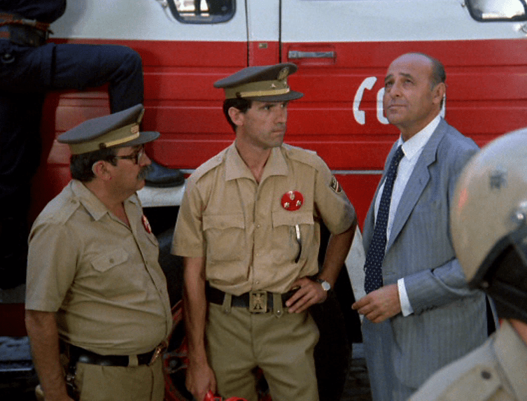 De l’autre côté, sur la place inondée de soleil, on s’agite pas mal. Eloy de la Iglesia bénéficie de moyens conséquents et surtout du soutien de l’armée, des pompiers et des forces de l’ordre. Les figurants sont conséquents (la séquence où la place est déblayée impressionne toujours autant), un hélicoptère est de la partie, ainsi que divers véhicules. Toute cette armada met en relief l’hypocrisie du monde politique, puisque l’action se déroule en pleine période électorale. Un gouverneur (impérial Fernando Guillén, La Loi du désir, Tout sur ma mère, El Pico 2), qui tient avec quelques grammes de cocaïne, vient se faire mousser et tente de s’imposer auprès des deux braqueurs. Ce qu’il ne sait pas, c’est que nos quatre compagnons apprennent à se connaître, se mettent à jouer aux cartes et se mettent même à danser. Et plus si affinités…