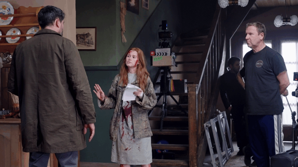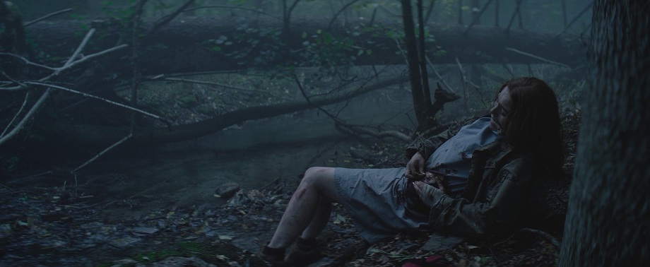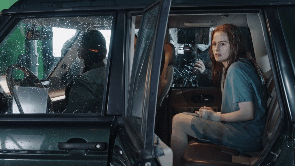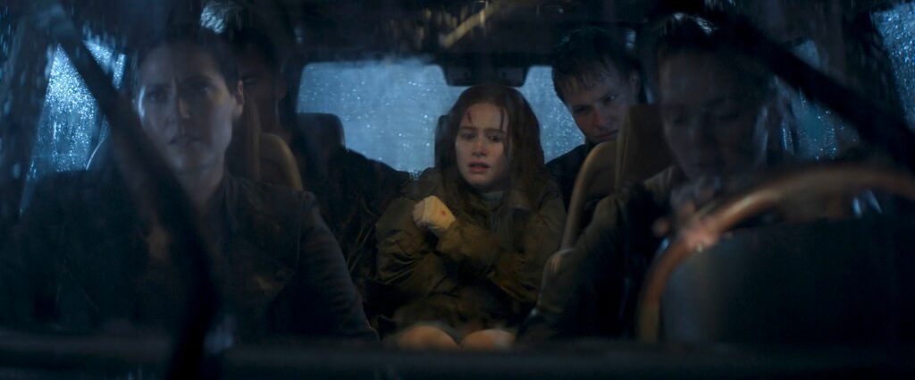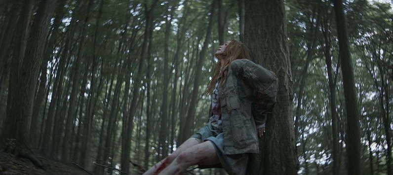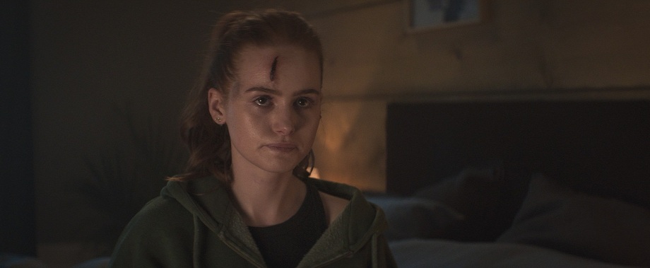 Maya évolue, joue les Rambo quand elle doit recoudre ses plaies ouvertes et évidemment sans anesthésie, prend enfin les armes pour se défendre si elle n’a pas le choix, et continue son chemin au milieu de nulle-part, pour essayer de se sortir de ce labyrinthe infernal. Quelques flashbacks dévoilent l’enfance de la Pin-Up Girl, quand celle-ci était à l’école, où elle fit sa première victime, par jalousie. Une autre élève du nom de Tamara. Puis, les masques tombent. Les Intrus : Chapitre deux laisse plus de place au comédien Gabriel Basso, vu dans Juré n°2 de Clint Eastwood, Super 8 de J. J. Abrams, A House of Dynamite de Kathryn Bigelow, ainsi qu’à l’excellente Ema Horvath (vue dans la série Le Seigneur des anneaux : Les Anneaux de pouvoir). Mais celui qu’on aime beaucoup et qui apporte un petit côté Twin Peaks à l’entreprise est Richard Brake (le Roi de la Nuit de Game of Thrones), qui incarne le shérif de la bourgade, étrange bonhomme dont on se demande si on peut compter sur lui, s’il ne dissimule pas des informations capitales, ou s’il ne fait pas partie du lot de psychopathes.