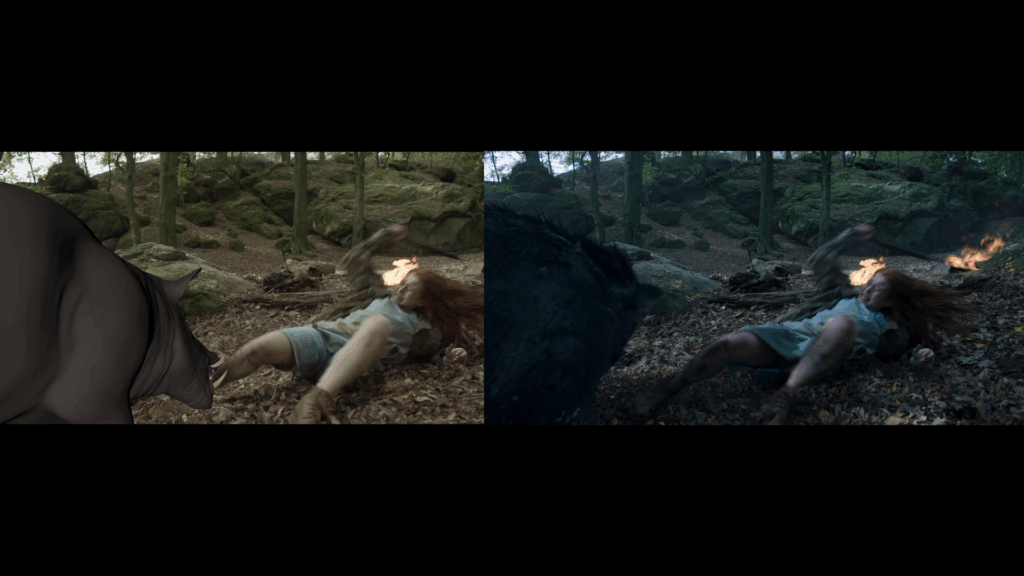 Ce qui étonne dans cette suite, ce sont ses nombreuses scènes quasi-muettes, centrées sur le personnage de Maya, seule, tentant d’échapper au trio infernal. Mais avant cela, Renny Harlin, même s’il s’en défend, rend un bel hommage à Halloween 2 (1981) de Rick Rosenthal. Mais il faut aussi « accepter » que l’hôpital s’avère désertique, sans personnel médical et même sans aucun autre patient. Des choses « hénaurmes » à approuver, et il y en aura d’autres dans Les Intrus : Chapitre deux, mais une fois que le spectateur s’est mis en tête que rien n’était réaliste, le spectacle fonctionne. C’est le cas pour LA scène la plus marquante du film, celle où Maya affronte, non pas la Pin-Up Girl ou ses camarades de jeu, mais…un sanglier qui s’en prend à elle dans la forêt. Oui oui, un bon gros mammifère omnivore, entièrement réalisé en images de synthèse bien sûr, qui souhaite mettre quelques bons coups de museau dans le joli fessier de l’actrice principale. Balance ton porc ! Le pire, c’est qu’on a beau se dire que les effets sont médiocres, on se laisse prendre, on rit et on a même peur pour notre héroïne à la chevelure flamboyante. Pari réussi donc.