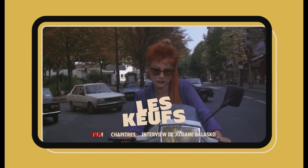 Comme pour Signes extérieurs de richesse, Sac de nœuds, Les Hommes préfèrent les grosses et Nuit d’ivresse, Rimini Éditions est allé à la rencontre de Josiane Balasko (15’). La comédienne/réalisatrice revient sur la genèse des Keufs (qu’elle n’avait pas prévu de réaliser au départ), évoque la solide collaboration avec le chef opérateur Dominique Chapuis, l’explosive interprétation de Jean-Pierre Léaud (« que personne ne voulait assurer, car il avait des démêlés avec la justice […] et qui s’est régalé avec ce personnage »). Josiane Balasko parle aussi du succès du film à sa sortie (« il a beaucoup marché dans les cités »), dont le titre pouvait échapper à la compréhension de beaucoup (et pour lequel elle s’est battue). Le casting est aussi passé au peigne fin.
