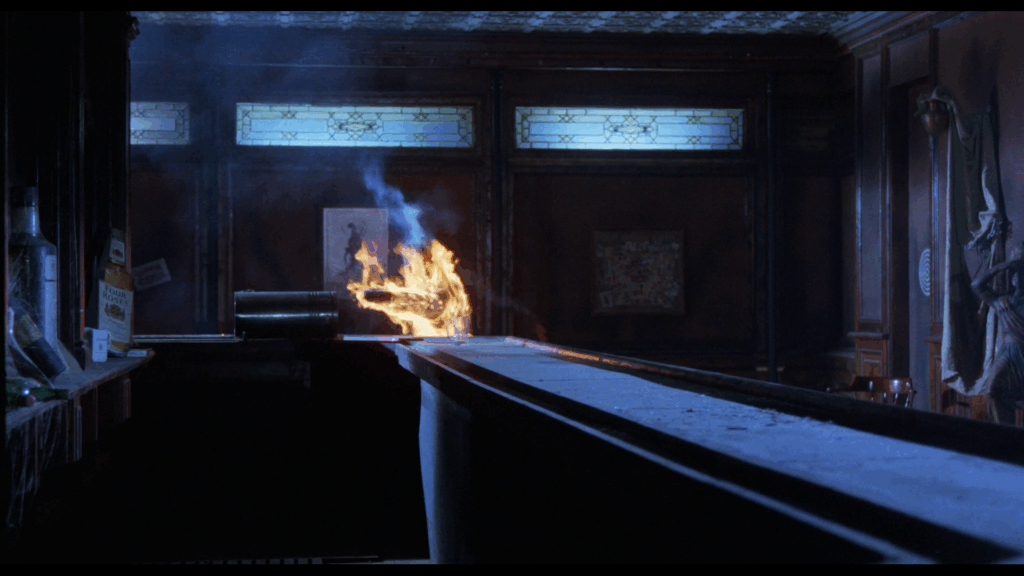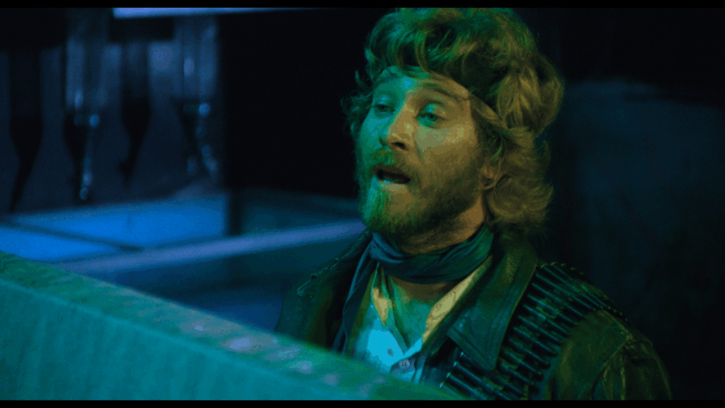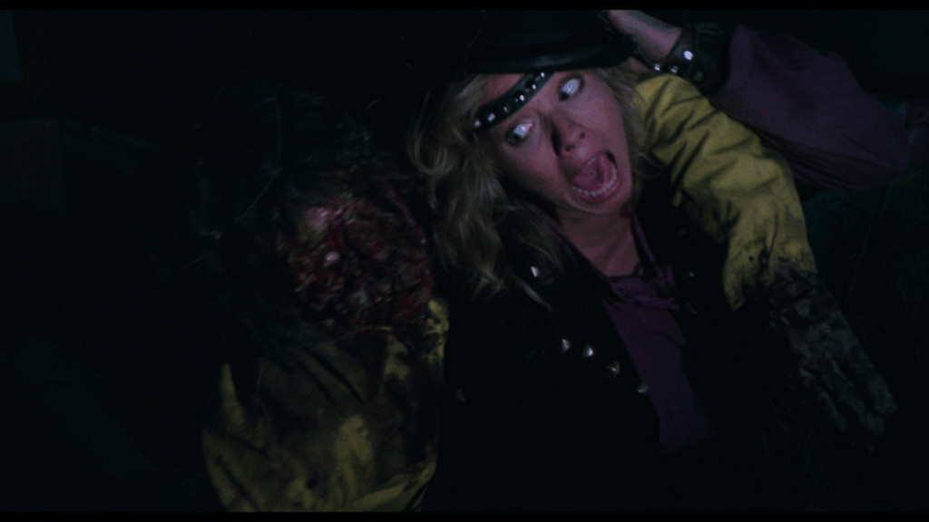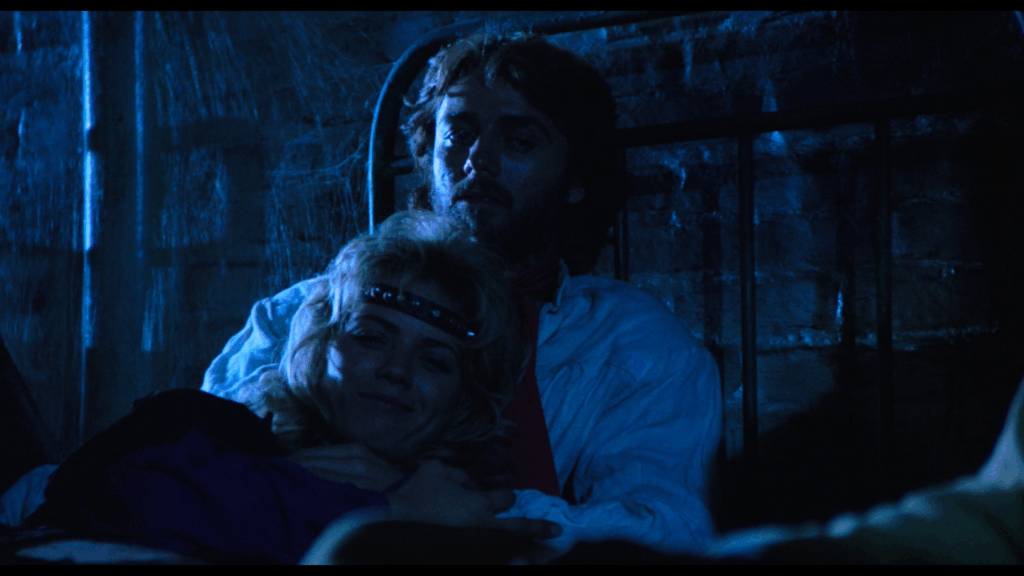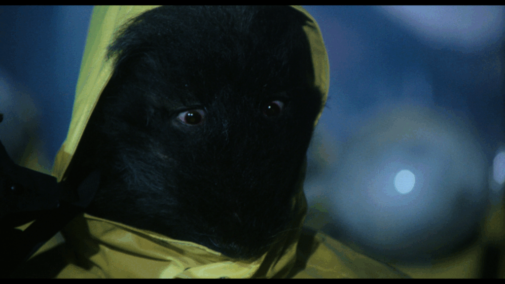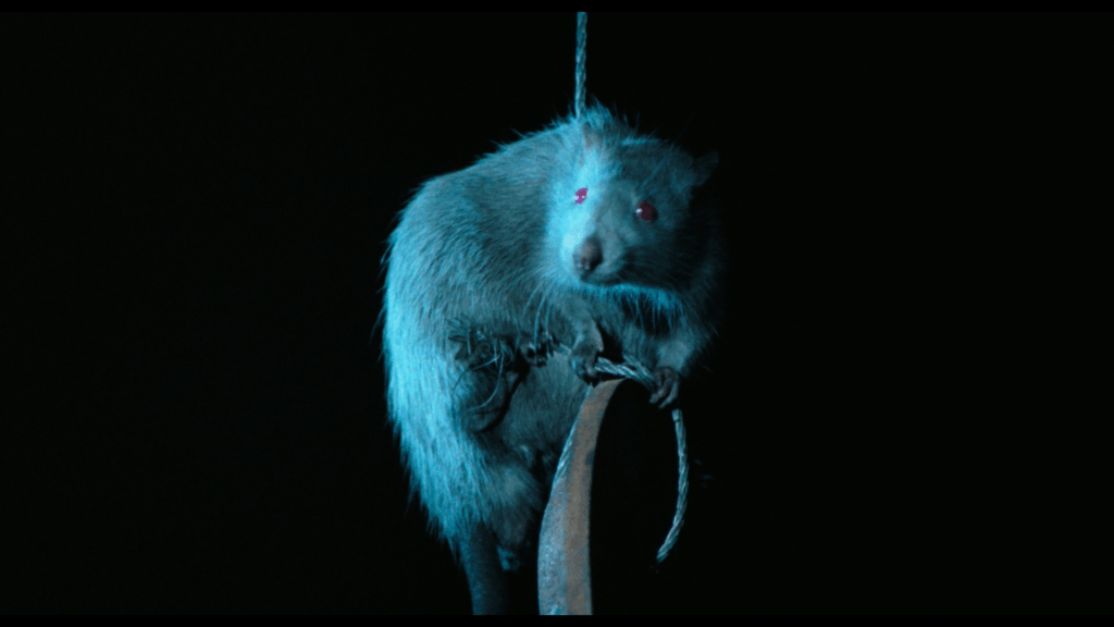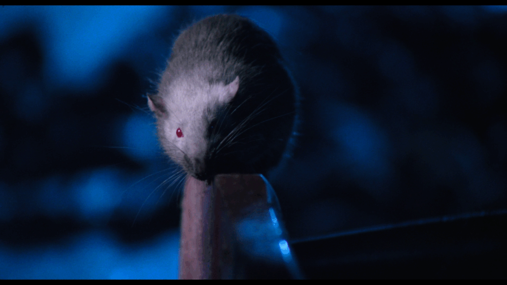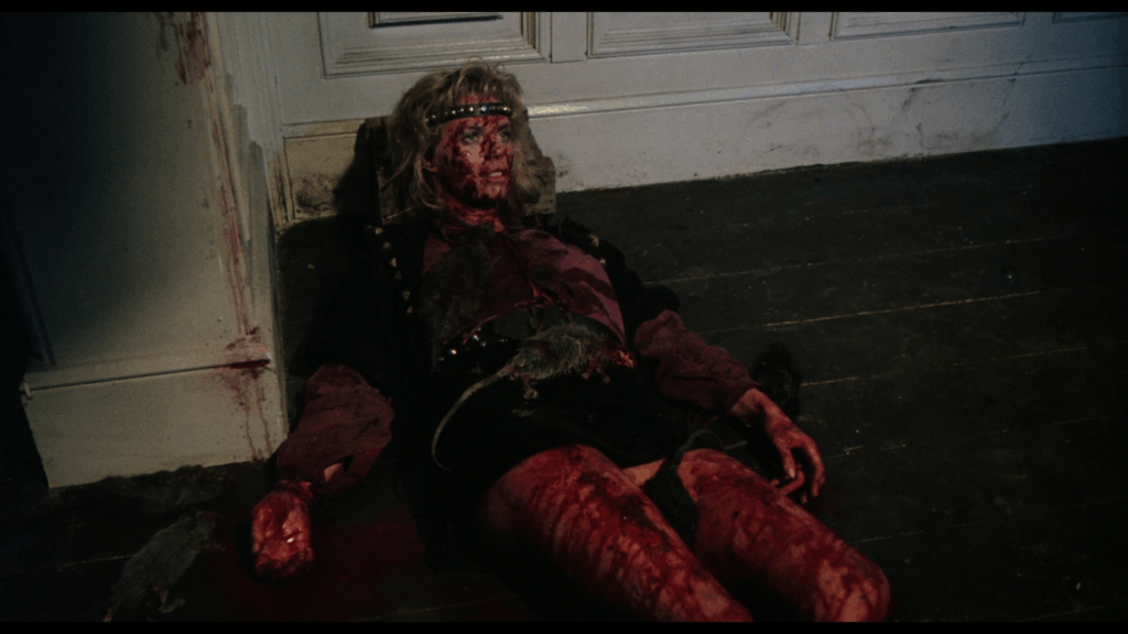 En fait, il ne se passe pas grand-chose dans Rats – Notte di terrore. On passe d’une séquence à l’autre sur un faux rythme, d’une scène où un des membres de la bande se fait bouffer, à celle où ses potes le découvrent, puis à une autre où ils décident d’affronter les bestioles, avant de repasser à un autre passage de vie à trépas, etc. Là-dessus, la musique électro sous Tranxène de Luigi Ceccarelli (Jours tranquilles à Clichy, Bianco Apache, Scalps), ou plutôt les deux ou trois mêmes accords qui reviennent en boucle, essayent de donner une impression de tension, de danger, ce qui rate systématiquement. Les protagonistes prennent l’air effrayé en beuglant « Il y en a partout !!! », alors que le cadre peine à être rempli par ces petits êtres qui n’avaient rien demandé, et qui avaient même été trempés dans un colorant noir (inoffensif on nous dit), pour leur donner un aspect agressif. Seule chose bien dans tout cela, les rats, ou plutôt les souris qui provenaient d’un laboratoire où elles devaient devenir des cobayes, ont été « sauvées » pour passer à la postérité autrement…sachant que certaines ont été réellement brûlées au lance-flammes pour les besoins de certaines séquences.