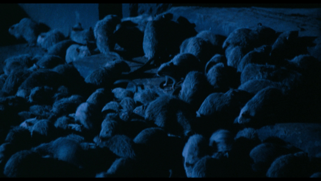Les Rats de Manhattan (connu aussi sous le titre Les Mutants de la seconde Humanité) a beau avoir été tourné avec trois francs six sous (convertissez en lires si vous le pouvez) et les comédiens payés 250 dollars par semaine (le tournage a duré moins d’un mois), certaines idées restent en mémoire. C’est le cas de ce rat qui sort de la bouche d’une des pauvres victimes. Rat qui avait réussi à s’infiltrer dans un sac de couchage, avant de s’engouffrer dans les parties intimes de la jeune donzelle alors nue dans son duvet…Autant dire que le rongeur a « voyagé » pour se retrouver entre les dents de son repas. Un effet spécial réalisé pour de vrai, à l’aide d’une tête de rat (la rumeur dit que ce serait une vraie), enveloppée dans une capote et placée dans la bouche de l’actrice, qui n’avait alors qu’à pousser l’astuce avec sa langue. Et du système D il y en a partout dans Les Rats de Manhattan. On se souviendra aussi longtemps de ce subterfuge, quand devant palier au manque de rats mis à disposition (qui étaient en fait tous morts, mais qui étaient utilisées tout de même, avec l’odeur que cela implique), l’équipe des effets mettent au point une bâche noire sur laquelle étaient collés des faux rongeurs en plastique (ou pas, on ne sait plus), qu’on déplaçait ensuite sur un tapis roulant, histoire de faire croire que toute la meute était en mouvement. Là-dessus, les réalisateurs devaient passer systématiquement sur la tronche effrayée des personnages.