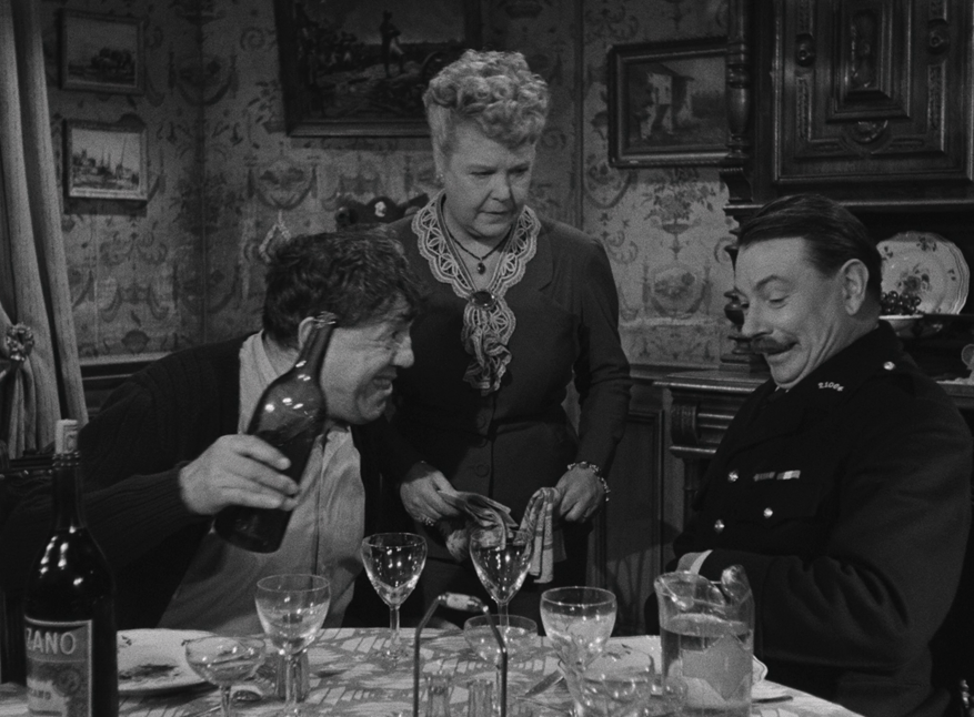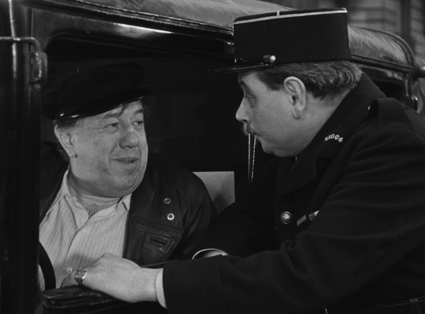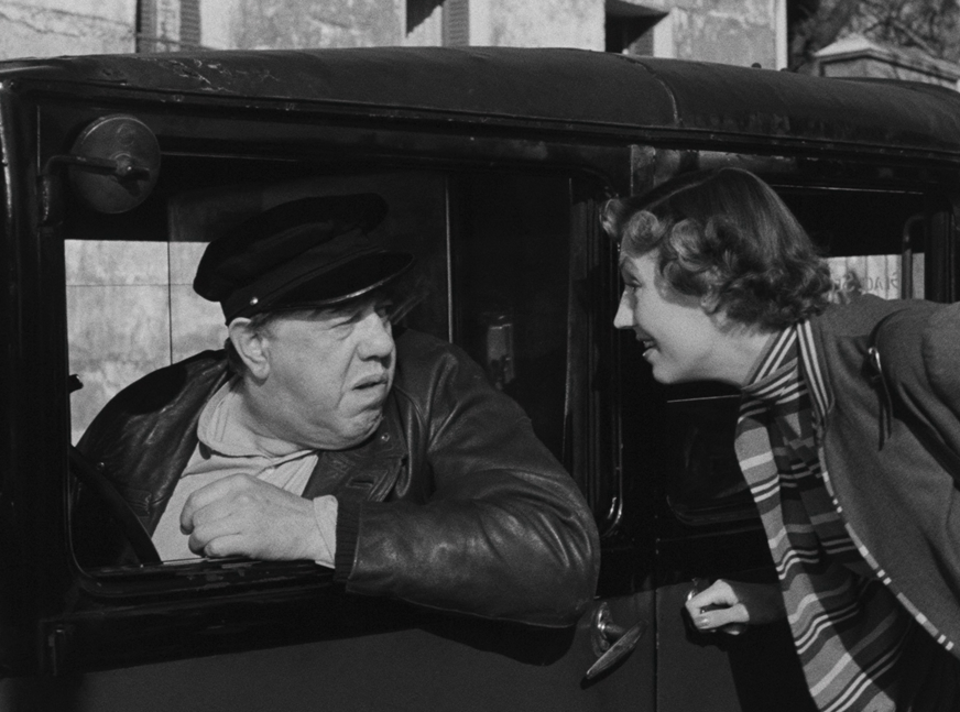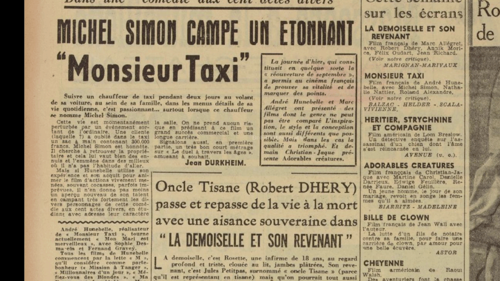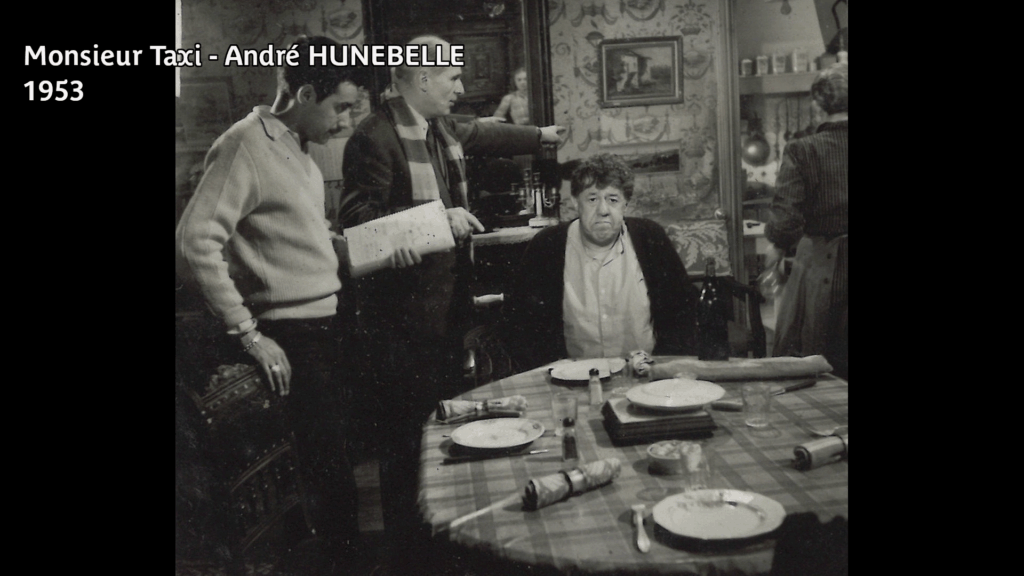 Si la seconde collaboration de Michel Simon avec André Hunebelle, L’Impossible Monsieur Pipelet (2,5 millions d’entrées) reste plus connue, Monsieur Taxi ne démérite pas et découvrir cette œuvre « de jeunesse » du réalisateur, son septième long-métrage, est une curiosité à part entière. Le film a évidemment été monté sur le seul nom de Michel Simon, alors entre Le Marchand de Venise de Pierre Billon et La Fille au fouet de Jean Dréville. Le comédien se délecte de ce rôle qui lui colle parfaitement à la peau, qui profite de sa gouaille, de son phrasé singulier, de son charisme hors-norme. Comme toujours, André Hunebelle entoure sa star de formidables seconds rôles : Jane Marken (Knock, Pétrus, Maxime, Chiens perdus sans collier), Jean Brochard (Les Diaboliques, Cinq tulipes rouges), Pauline Carton (Le Comédien, Si Versailles m’était conté…), Jeanne Fusier-Gir (Le Jardinier d’Argenteuil, Marie-Octobre, Le Trou normand), Claire Olivier (Lady Paname, Le Père tranquille), Nathalie Nattier (Brelan d’as, Les Portes de la nuit, Seul dans la nuit) et même un certain Louis de Funès (le peintre de la place du Tertre, c’est lui!) sont les fameuses « gousses d’ail » qui parfument le gigot comme le disait l’acteur Dominique Zardi, quand il répondait aux journalistes qui critiquait toujours le fait qu’André Hunebelle fasse très souvent appel aux mêmes seconds ou troisièmes couteaux pour ses films. Ils sont tous excellents dans Monsieur Taxi, qui enchaîne les petites scènes comme des cases de bande dessinée, avec un léger fil rouge pour les relier ensemble.