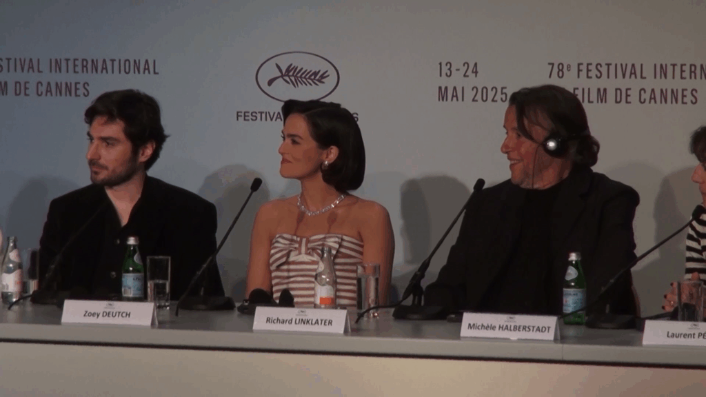 À la base de Nouvelle Vague, il y a un scénario coécrit par Holly Gent et Vince Palma, qui avaient déjà signé l’excellent Orson Welles & moi pour Richard Linklater, ou l’histoire du premier triomphe du Mercury Theatre. À cela s’ajoute la collaboration française de Michèle Pétin et Laetitia Masson, une association franco-américaine aussi évidente qu’indispensable. Puis la magie opère dès les premières secondes, avec ce doux ronronnement d’un projecteur de cinéma, l’apparition de visages reconnaissables de personnalités confortablement installées dans une salle enfumée où est projetée Bonjour tristesse d’Otto Preminger. La fantaisie fait son office, on sait qu’il ne s’agit pas des vrais évidemment, mais le casting, exceptionnel, est l’un des plus réussis de l’année 2025. Si elle apparaît que subrepticement, Alix Bénézech prête ses traits magnifiques à Juliette Gréco, tandis qu’Antoine Besson apporte sa rondeur à Claude Chabrol. Les silhouettes fines d’Éric Rohmer et Jacques Rivette passent devant la caméra, des noms connus résonnent à nos oreilles de cinéphiles/ages (Richard Balducci, José Bénazeraf, Daniel Boulanger), des mythes déjà installés font une apparition (Jean Cocteau, Jean-Pierre Melville, Robert Bresson, Roberto Rossellini), avant de laisser place aux jeunes trublions des « Cahiers ».