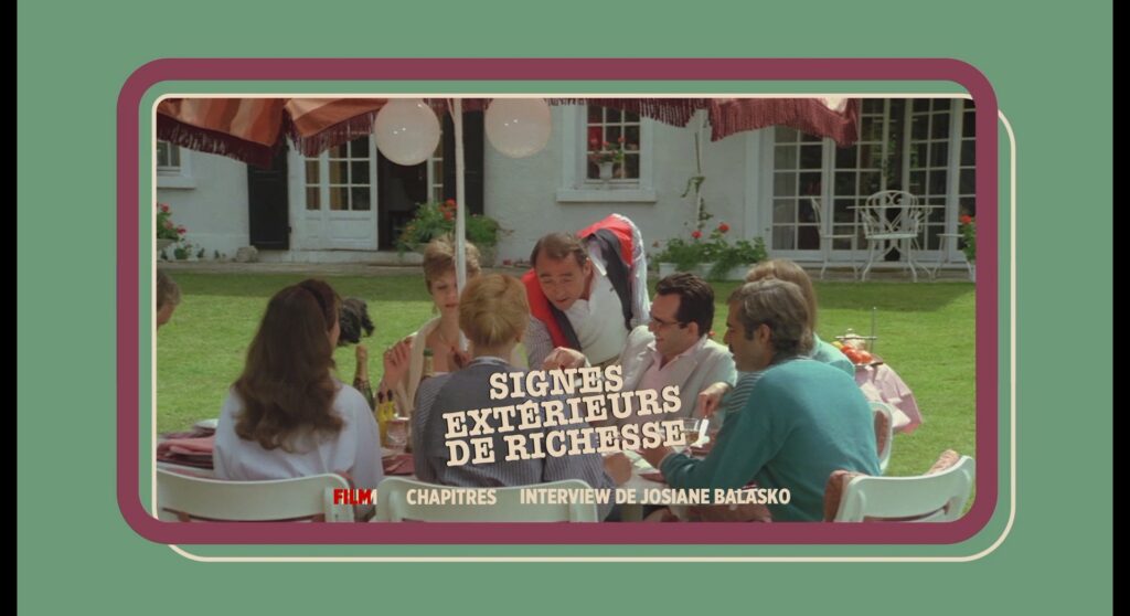 Jean-Pierre Vasseur de Rimini Éditions est allé à la rencontre de Josiane Balasko. Durant cette petite interview (8’), la comédienne partage quelques souvenirs liés au tournage de Signes extérieurs de richesse. Elle évoque Jacques Monnet (« très enthousiaste et au rire communicatif »), le travail avec Claude Brasseur et Jean-Pierre Marielle, les débuts de Jean Reno, sa garde-robe (« tristoune ») qui devait représenter la carapace de son personnage. Rapide, mais c’est toujours mieux que rien !
