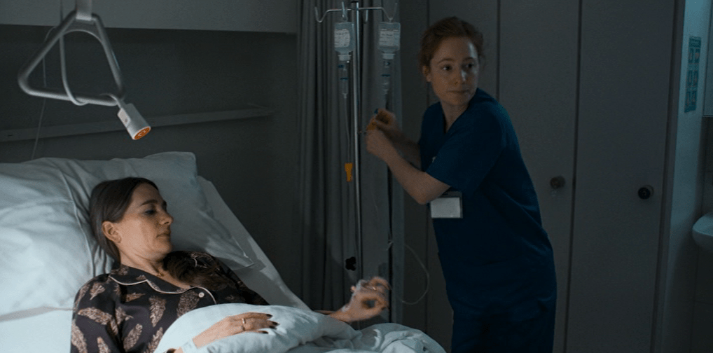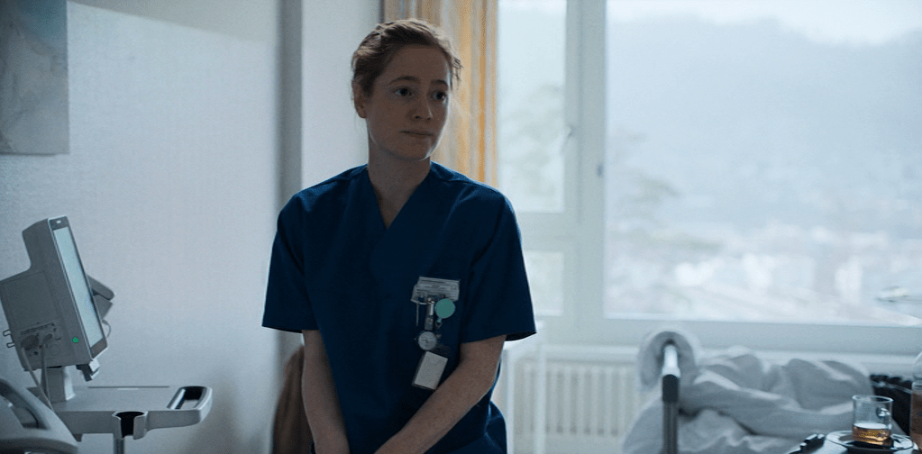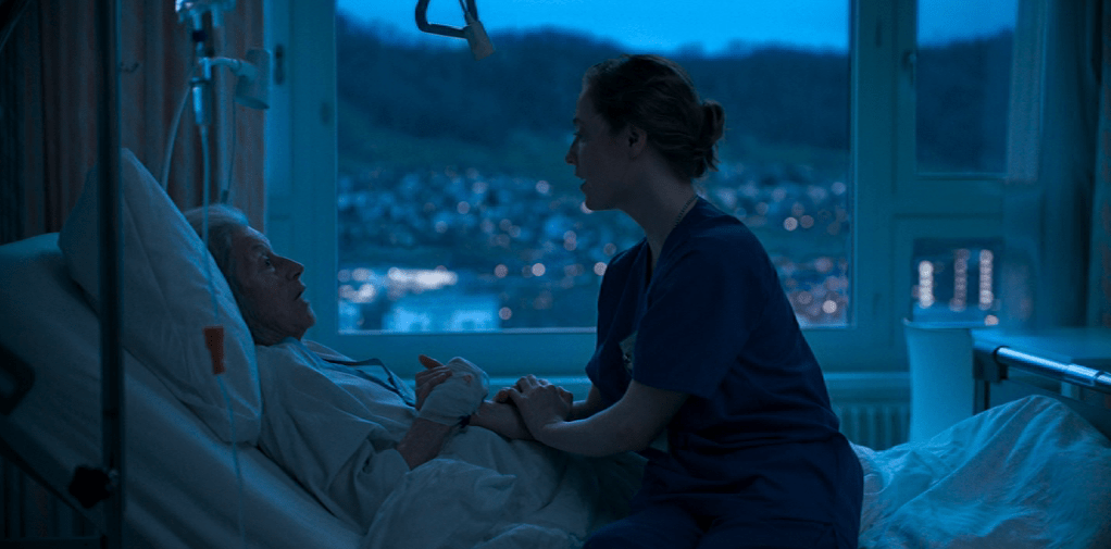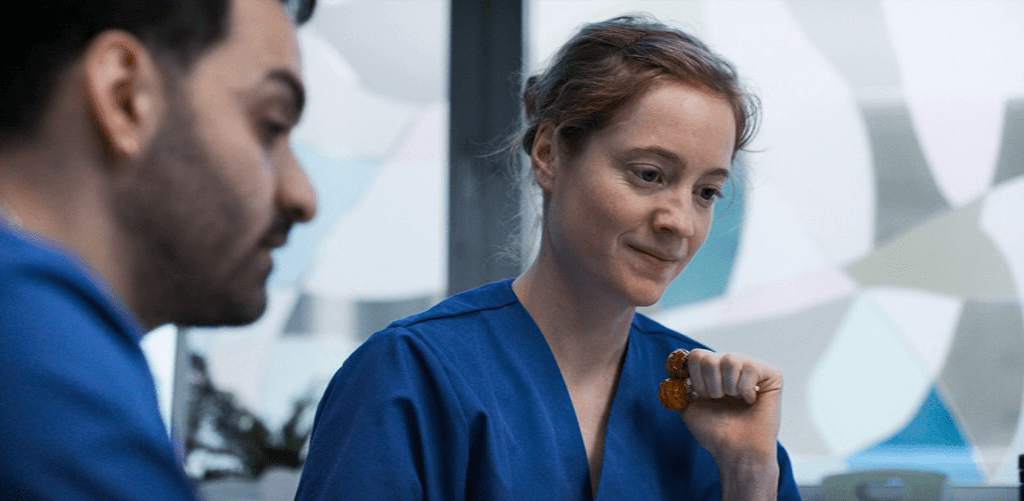 En première ligne est l’un des films les plus immersifs de l’année 2025. Les premiers plans montrent les blouses bleues et autres combinaisons du personnel soignant, sortir de la blanchisserie, comme s’il s’agissait d’armures prêtes à être enfilées avant d’aller sur le pied de guerre. Floria débarque, passe par le vestiaire, partage quelques banalités avec une collègue (« Et tes vacances ? » «Super»), enfile ses chaussures de « sport », la soirée, ou plutôt la nuit commence. Léonie Benesch impressionne par la facilité déconcertante avec laquelle elle réalise à vitesse grand V les différents gestes techniques qui règlent la vie professionnelle de son personnage. La caméra de Petra Biondina Volpe, soutenue par l’incroyable boulot de la cheffe opératrice Judith Kaufmann (Corsage, L’Audition), scrute chacun de ses mouvements, la suit de dos souvent, Floria passant de chambre en chambre, réconfortant comme elle le peut, subissant les invectives de certains patients sur le fait qu’elle ne passe pas assez les voir, tout en essayant de tenir le service avec son autre collègue et une assistante, pendant que les médecins sont au bloc.